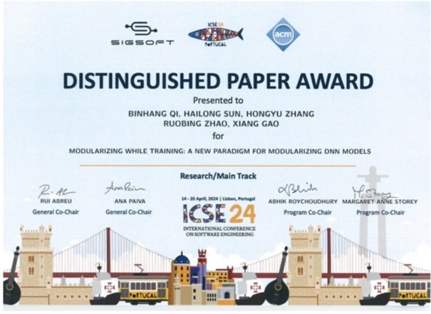 在本届SANER会议中,williamhill中国官方网站硕士生洪硕作为第一作者的论文“Investigating and Detecting Silent Bugs in PyTorch Programs”荣获IEEE Computer Society TCSE Distinguished Paper Award。在本届ICSE会议上,williamhill中国官方网站博士生齐斌航作为第一作者的论文“Modularizing while Training: A New Paradigm for Modularizing DNN Models”荣获ACM SIGSOFT Distinguished Paper Award。这是北航首次以第一作者单位在SANER和ICSE会议上获得该类奖项。