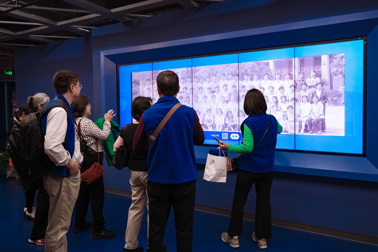 校史馆参观接近尾声时,校友们还在电子屏上找到了自己当年的毕业照,惊喜之情溢于言表,于是来到老主楼前,按照当年毕业照的站位,又重新拍了一张跨越40年的合影。