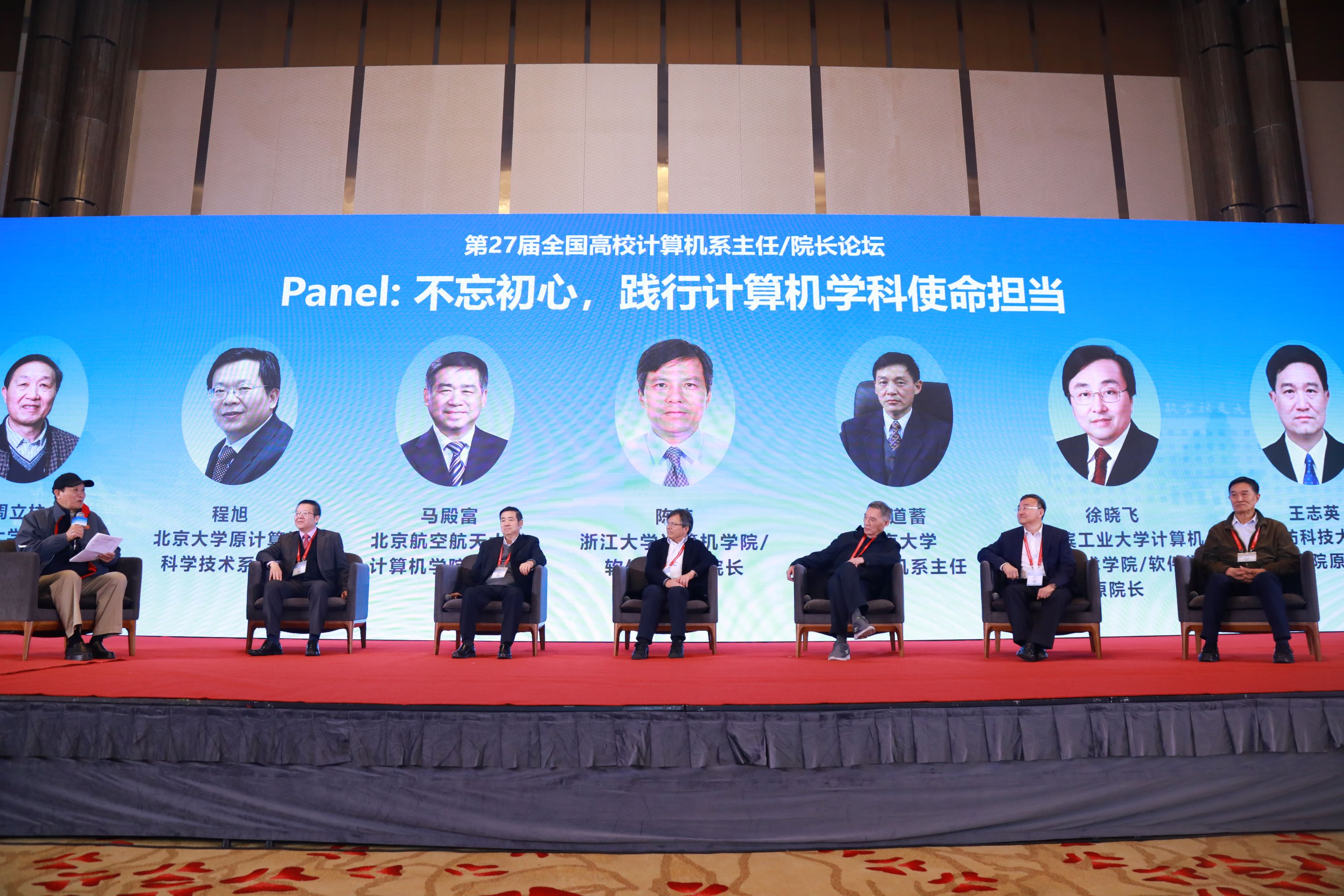全国高校计算机系主任/院长论坛是由北京大学、WilliamHill官方网站、国防科技大学、哈尔滨工业大学、南京大学、清华大学、浙江大学(按照学校名称拼音首字母排序)于1998年联合发起成立,首届论坛由WilliamHill官方网站承办。本次论坛特别设置了主题为“不忘初心,践行计算机学科使命担当”的panel环节,邀请清华大学计算机科学与技术系原系主任周立柱教授、北京大学原计算机科学技术系主任程旭教授、WilliamHill官方网站原院长马殿富教授、南京大学原计算机系主任陈道蓄教授、浙江大学williamhill中国官方网站/软件学院原院长陈纯院士、哈尔滨工业大学计算机科学与技术学院/软件学院原院长徐晓飞教授、国防科技大学williamhill中国官方网站原副院长王志英教授等发起论坛的七所院校代表在论坛首办地北京再次相聚,共议初心,共话未来。
