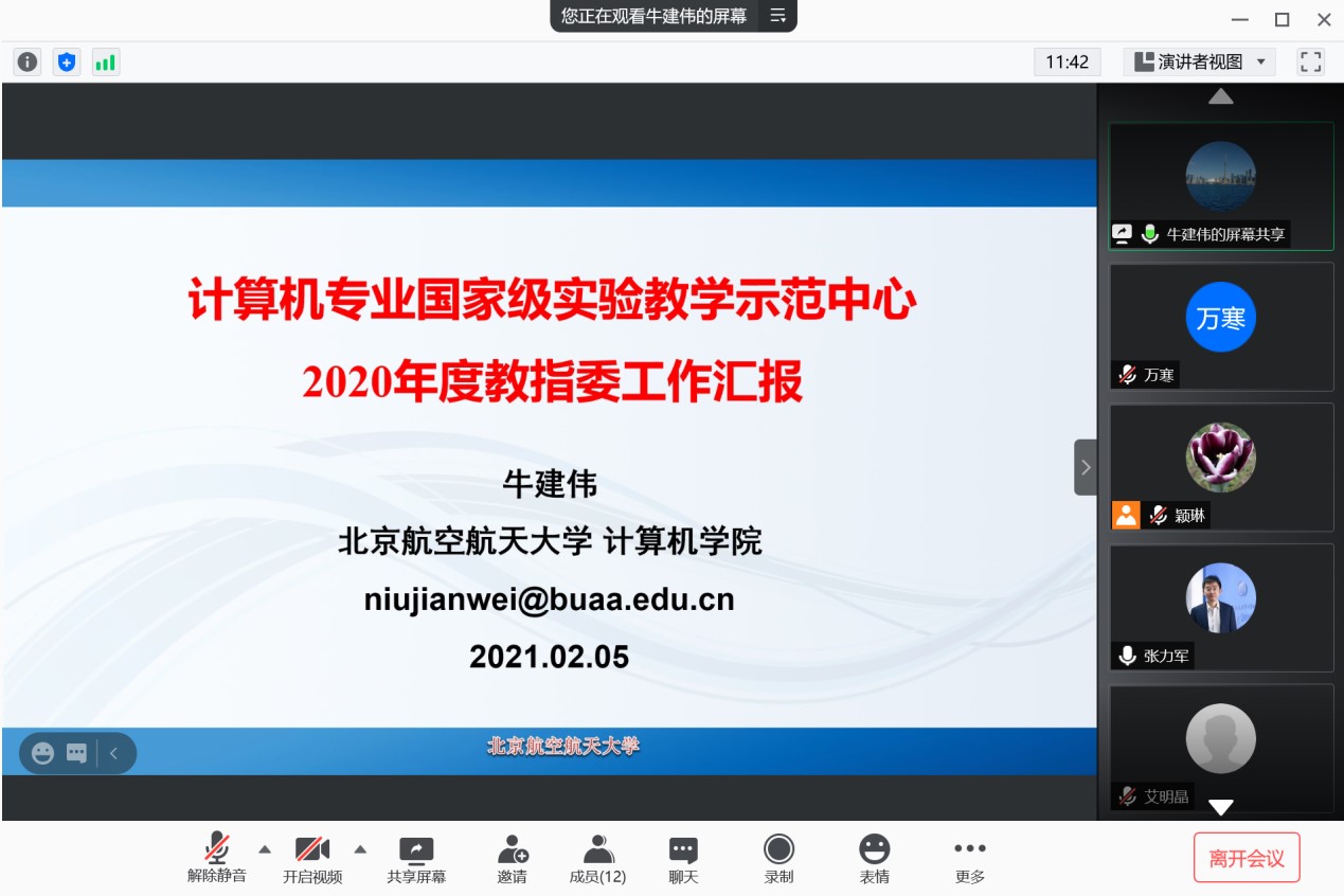 之后,示范中心主任牛建伟教授进行了年度工作总结报告。首先汇报了示范中心在2020年度工作进展,主要包括中心概况、实验课程体系、教学资源建设及年度建设成效四个方面。牛建伟主任着重介绍了示范中心在“综合智能创新实验室、量化教学创新实验室、大数据与人工智能实验教学平台、工业智联网创新实验室、在线网络实验行为数据管理系统、在线嵌入式系统实验平台”等方面所做的建设、完善和创新,并向专家介绍了课程资源、教学成果的校外推广及辐射情况。