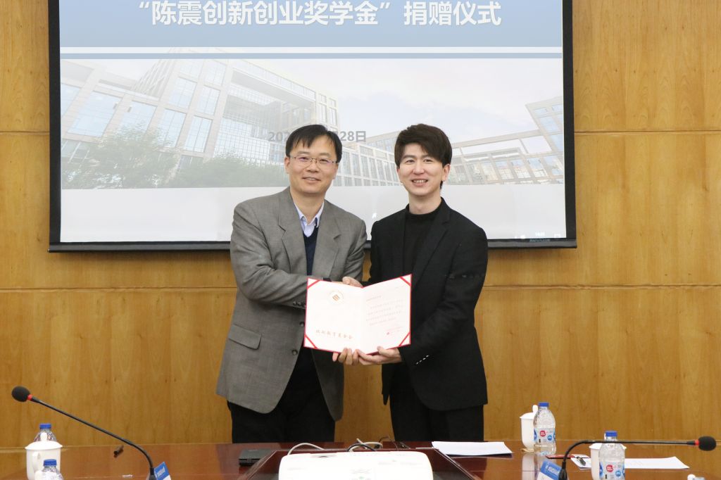 李建欣副院长回顾了陈震在校期间积极参加科研工作与创新创业实践、取得多项成果的事迹。他表示,捐赠奖学金体现了陈震的社会责任感和对学院的深厚感情,希望陈震作为优秀校友,继续为学院的发展建言献策。