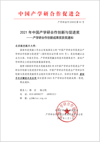 2022年1月5日,中国产学研合作创新与促进奖评奖结果公布。我院虚拟现实技术与系统国家重点实验室副主任郝爱民教授和李帅教授、潘俊君教授、王莉莉教授、吴洪宇博士、高阳博士等共同申报的“虚拟手术关键技术及应用”项目,获得2021年度中国产学研合作创新成果奖一等奖。
