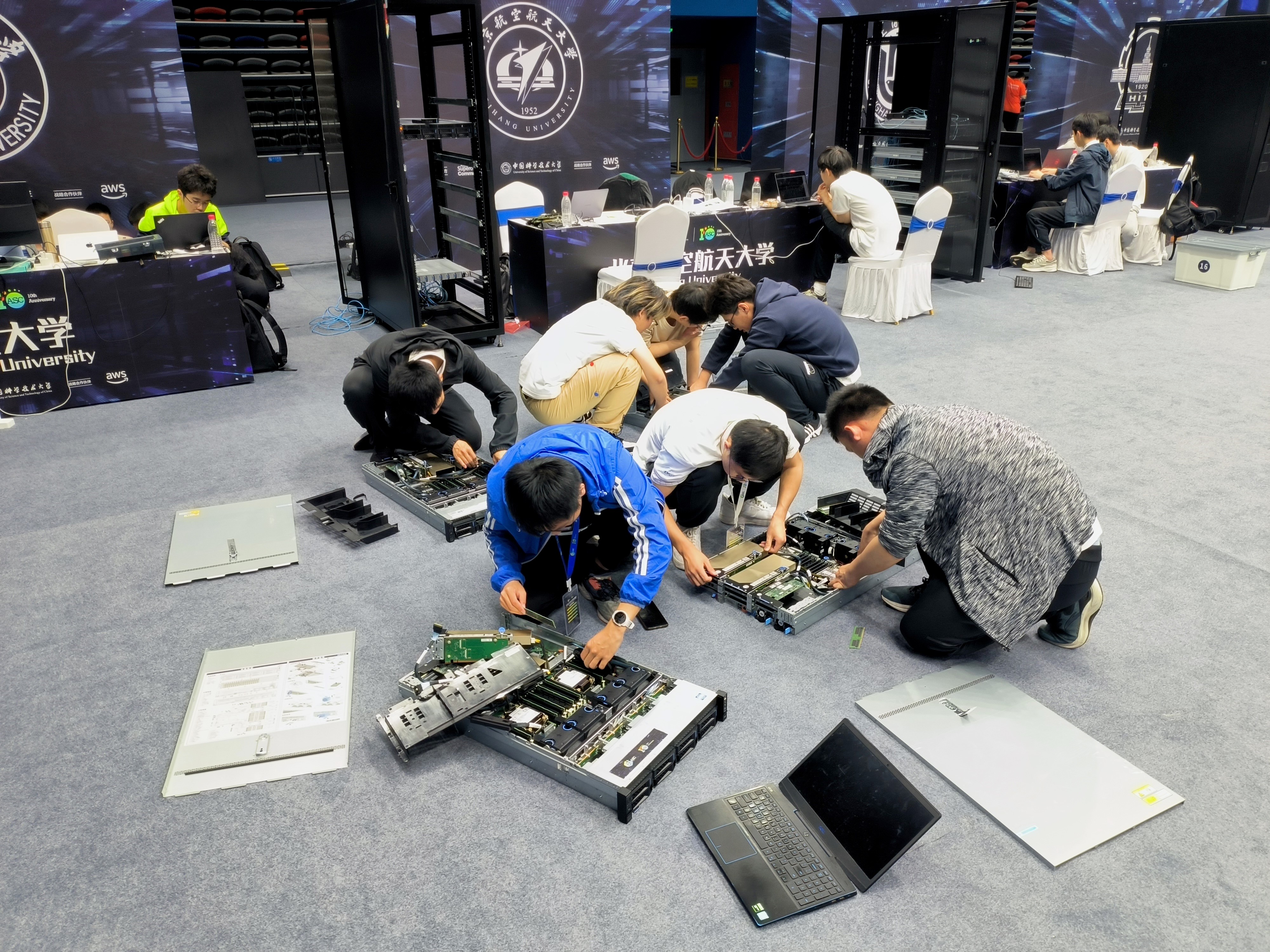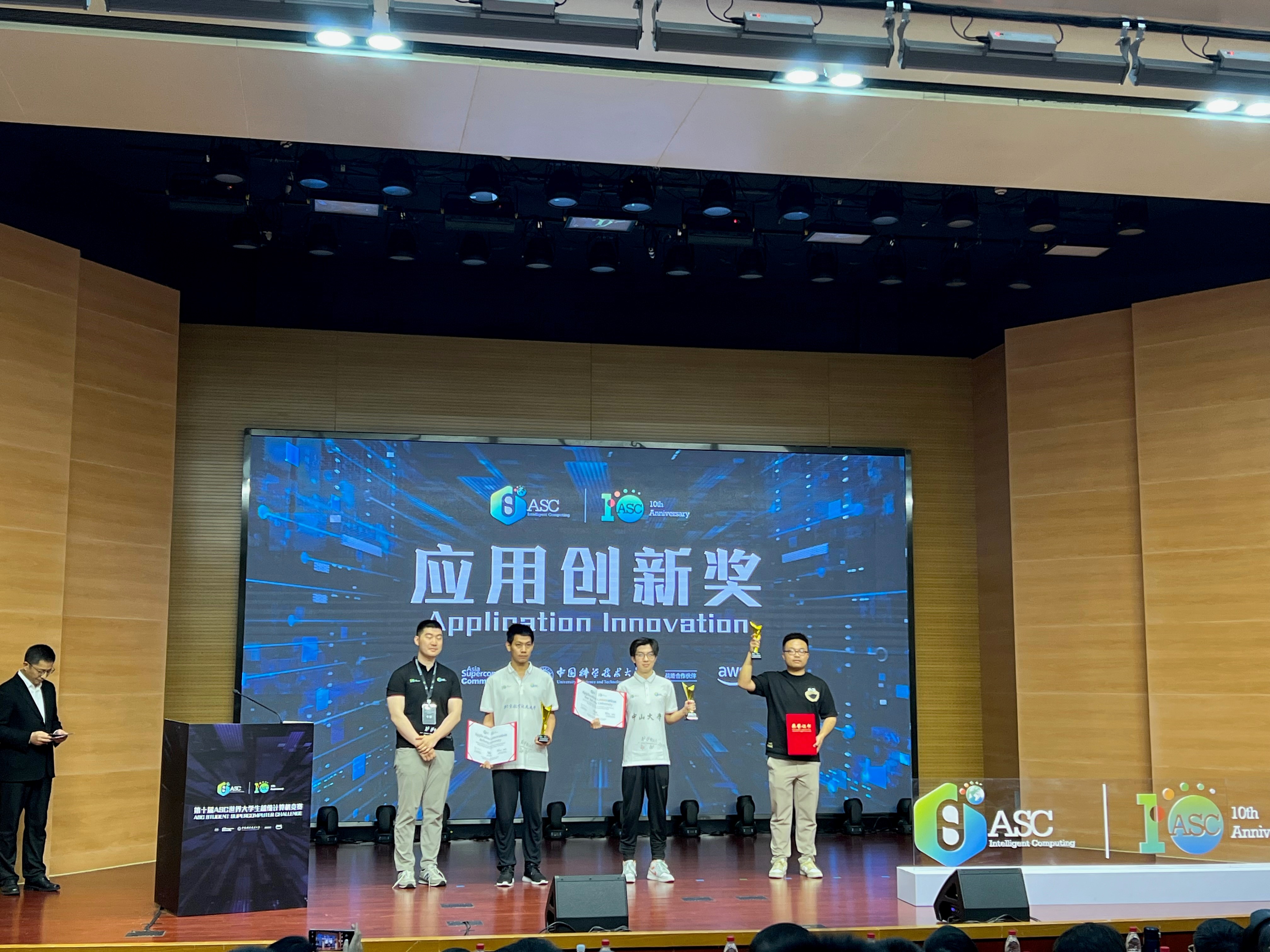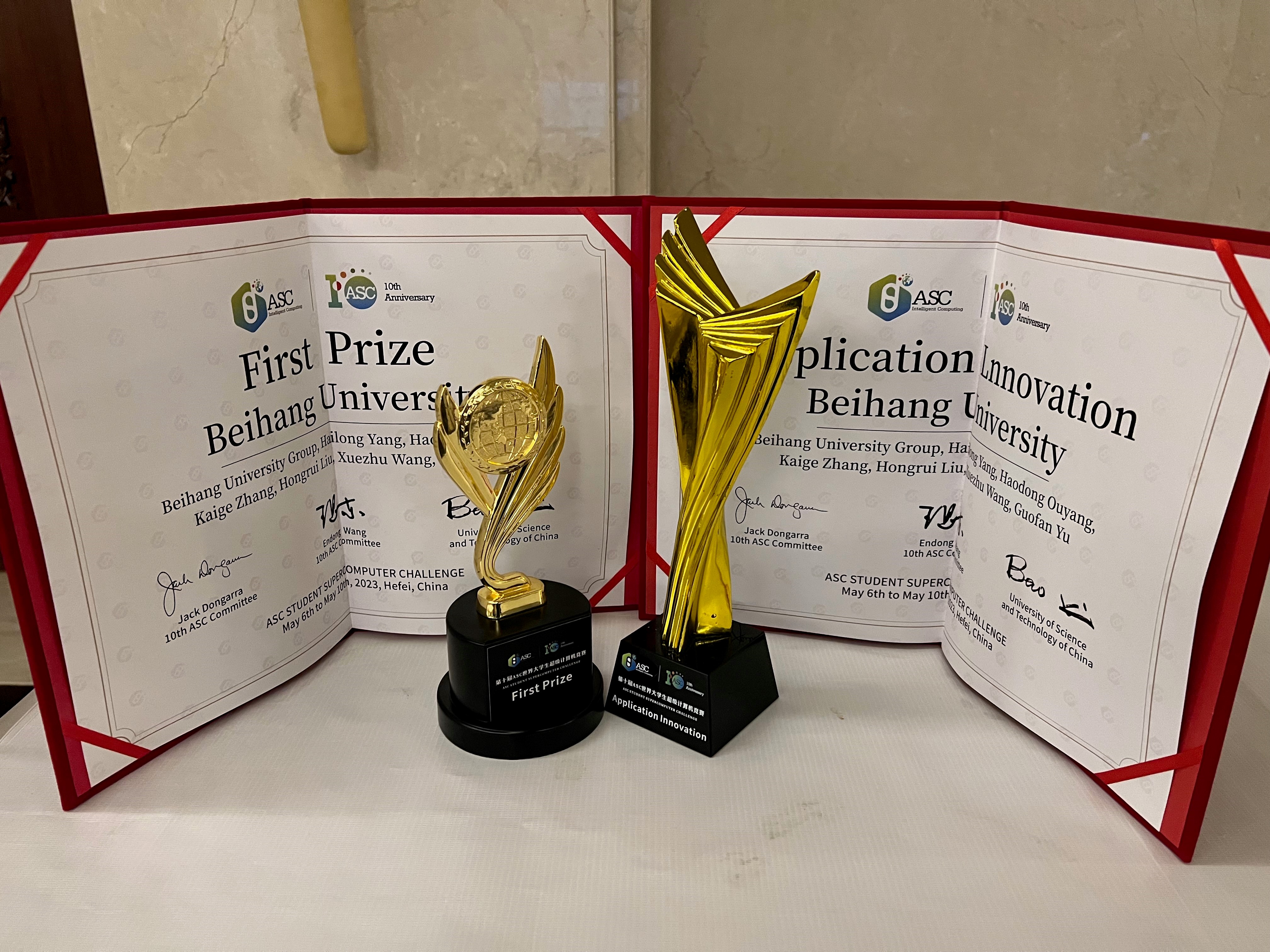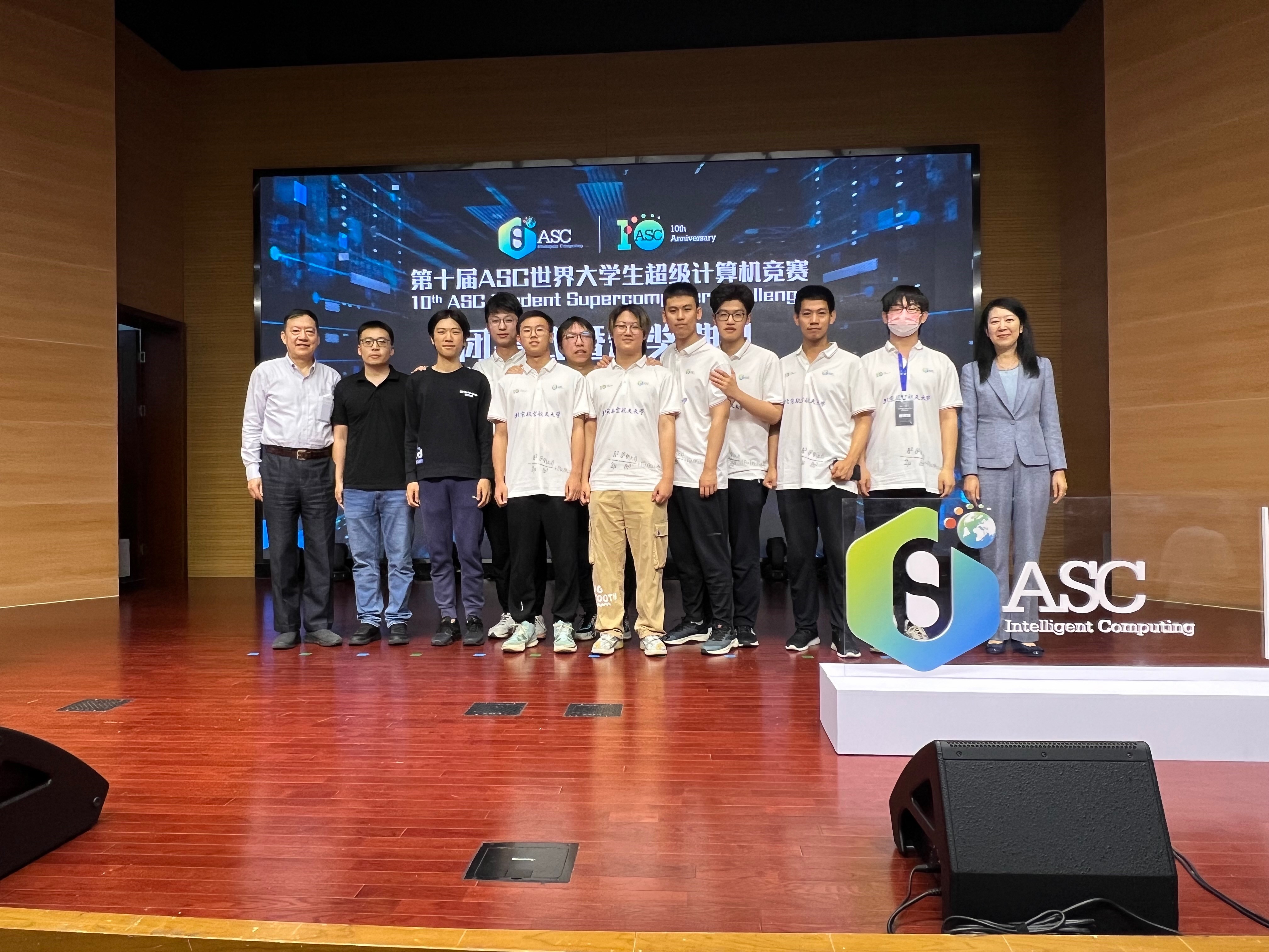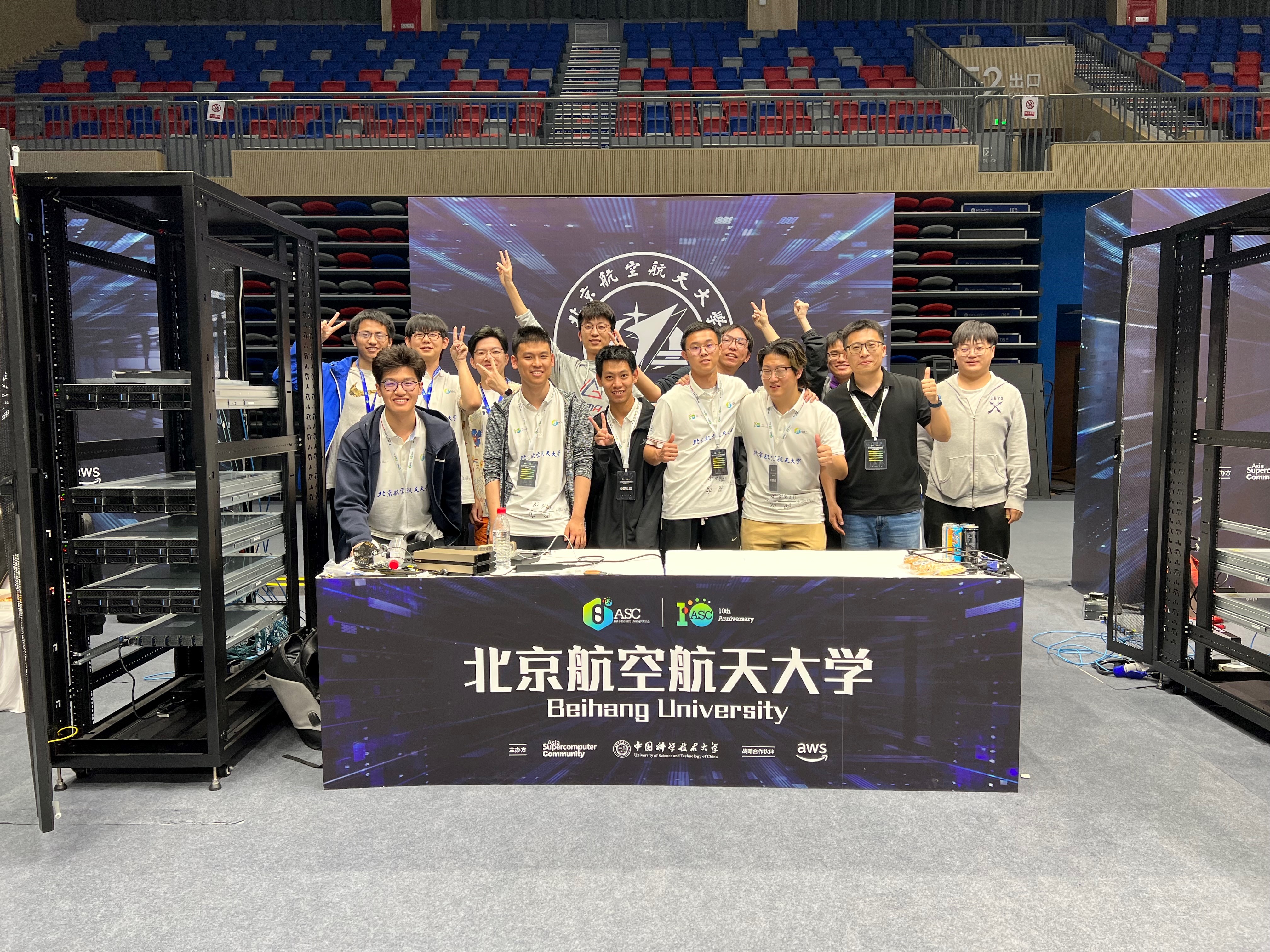 5月10日全球规模最大的世界大学生超级计算机竞赛(ASC)总决赛在中国科学技术大学落下帷幕,在北航williamhill中国官方网站杨海龙副教授的悉心指导下,由来自williamhill中国官方网站的五名本科生参赛队员欧阳皓东(队长)、刘鸿睿、余国帆、张凯歌、王雪竹,以及五名观摩队员仲书璋、杜劭康、吴飞扬、孔昊然、安达楷组成的北航超算队在分子动力学模拟deepMD、海洋数值模拟FVCOM等多道赛题中取得了优异成绩。最终,北航超算队荣获第十届ASC全球总决赛一等奖和应用创新奖。这是北航超算队第九次获得ASC全球总决赛一等奖,彰显了北航本科生扎实的计算机系统结构知识和优秀的超算创新能力,也是williamhill中国官方网站对“教赛研”相结合的新工科培养模式的成功探索。
