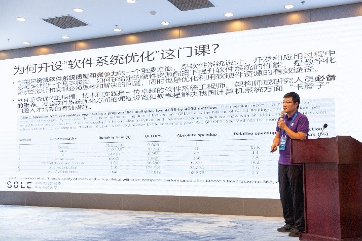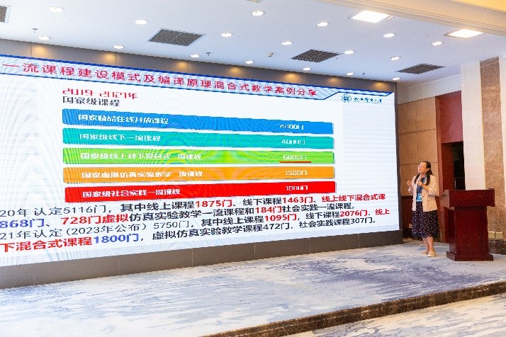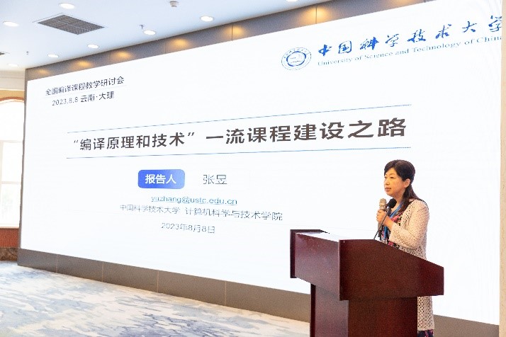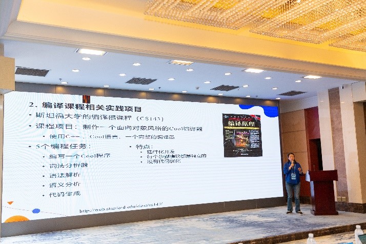 主题报告环节,首先由四位今年获批国家一流本科课程的编译课程团队进行报告分享。分别为中国科技大学张昱教授带来“‘编译原理和技术’一流课程建设之路”、武汉大学杜卓敏副教授带来“武汉大学‘编译原理’一流课程建设及申报体会交流”、合肥学院吴晓琴教授带来“一流课程建设探索与体会”以及哈尔滨学院詹丽丽老师带来“编译原理一流课程建设分享”。接着,西安交通大学赵银亮教授带来“基于正则语言理论的词法分析教学研讨”、西安邮电大学教务处处长王曙燕教授带来“西邮一流课程建设模式及编译原理混合式教学案例分享”、华东师范大学郭健美教授带来“软件系统编译优化的教学实践”、大连理工大学徐秀娟副教授带来“编译技术课程实践教学思考”。云南大学软件学院杨云教授代表承办单位带来“云南大学人工智能专业建设与交流”。头歌生态合作中心主任作为企业代表带来“面向虚拟校验的大规模实践教学创新与产教生态系统”。