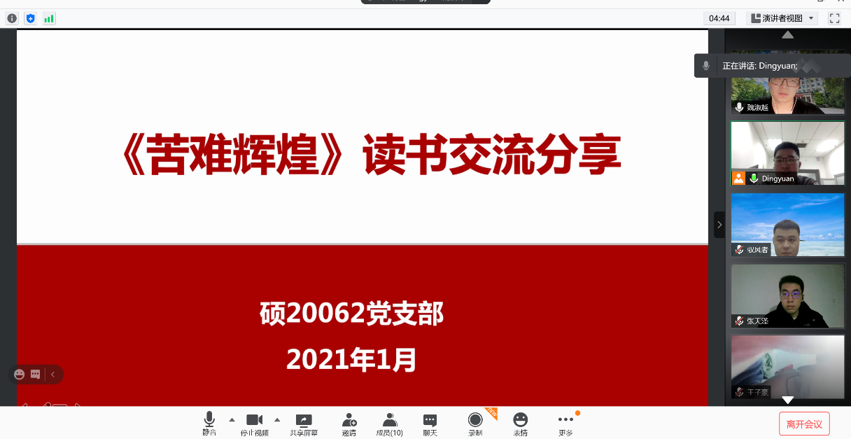 本次读书分享活动是williamhill中国官方网站硕20062党支部“苦难而辉煌”——建党百年系列又一学习活动。接下来,硕20062党支部将继续有序开展各项学习活动,确保支部党员加深对我党革命先辈大无畏精神的认识,缅怀革命先烈,加强党性修养,为成为新时代的优秀大学生党员不懈奋斗。