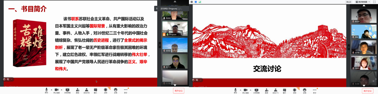 本次读书分享活动以红色历史经典《苦难辉煌》为中心,鼓励党员深刻体会苦难而又光辉的共产党史,学习革命前辈们的可贵品质。本次分享活动主要包含两个环节:在《苦难辉煌》书籍介绍环节,所有党员认真聆听,把握历史主线;在交流分享环节,全体党员踊跃发言,积极交流,以所有无私奉献、敢于斗争的革命先辈们为榜样,表达对中国共产党在艰难困苦之中走向辉煌的敬佩之情,并更加珍惜如今来之不易的和平昌盛。