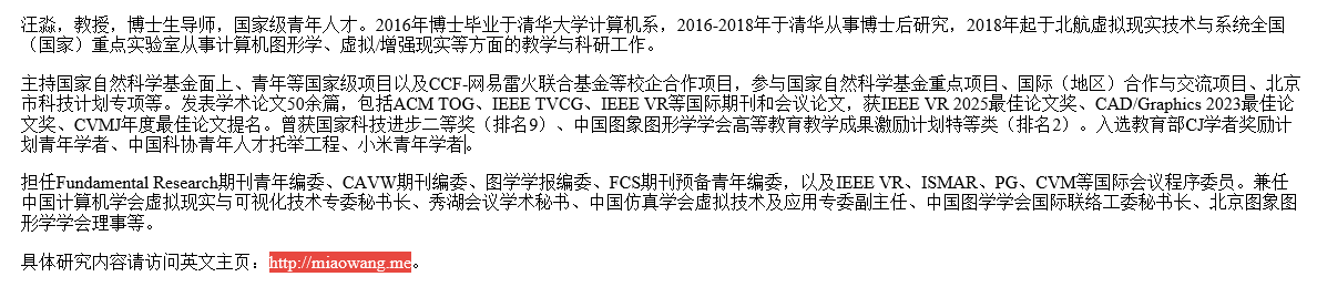 姓名:Wang Miao 职称:Professor 座机: 邮编:100191 办公地址:WilliamHill官方网站新主楼 电子邮箱:miaow@buaa.edu.cn 个人主页:https://shi.buaa.edu.cn/wangmiao